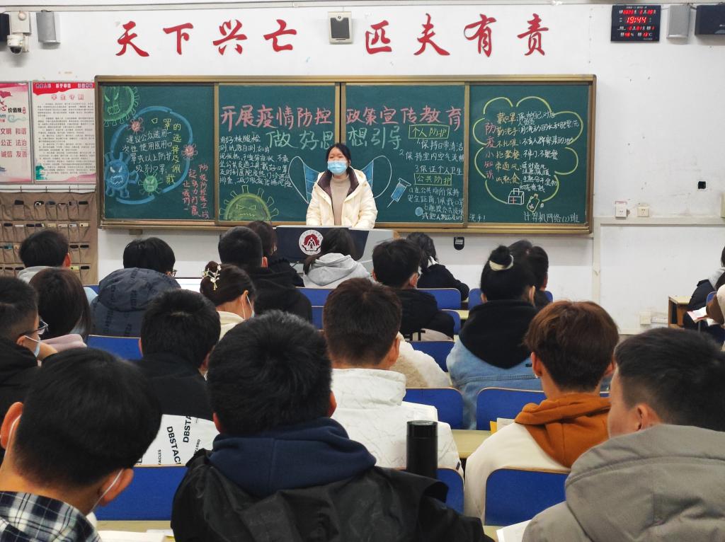 在疫情政策宣传班会上,辅导员带领同学们重温了上学期疫情防控工作的重点要求,明确了本学期乙类乙管政策的具体安排,两者之间的区别等等,着重从校园内突发状况的报送方式从2小时内延长至24小时内,隔离措施从强制到不强制,核酸检测自愿,校园内每天2次体温健康监测等方面进行讲解。